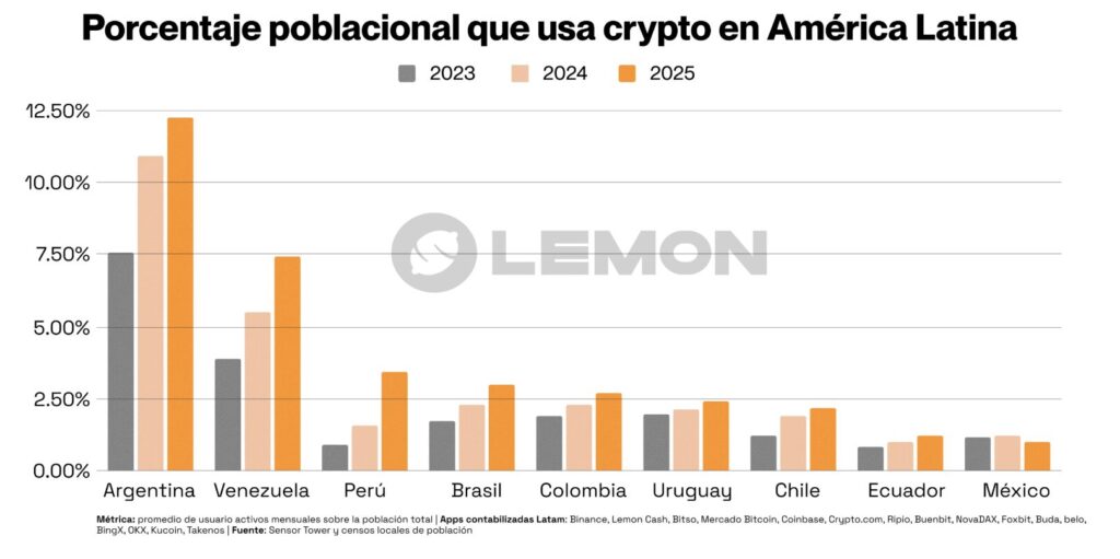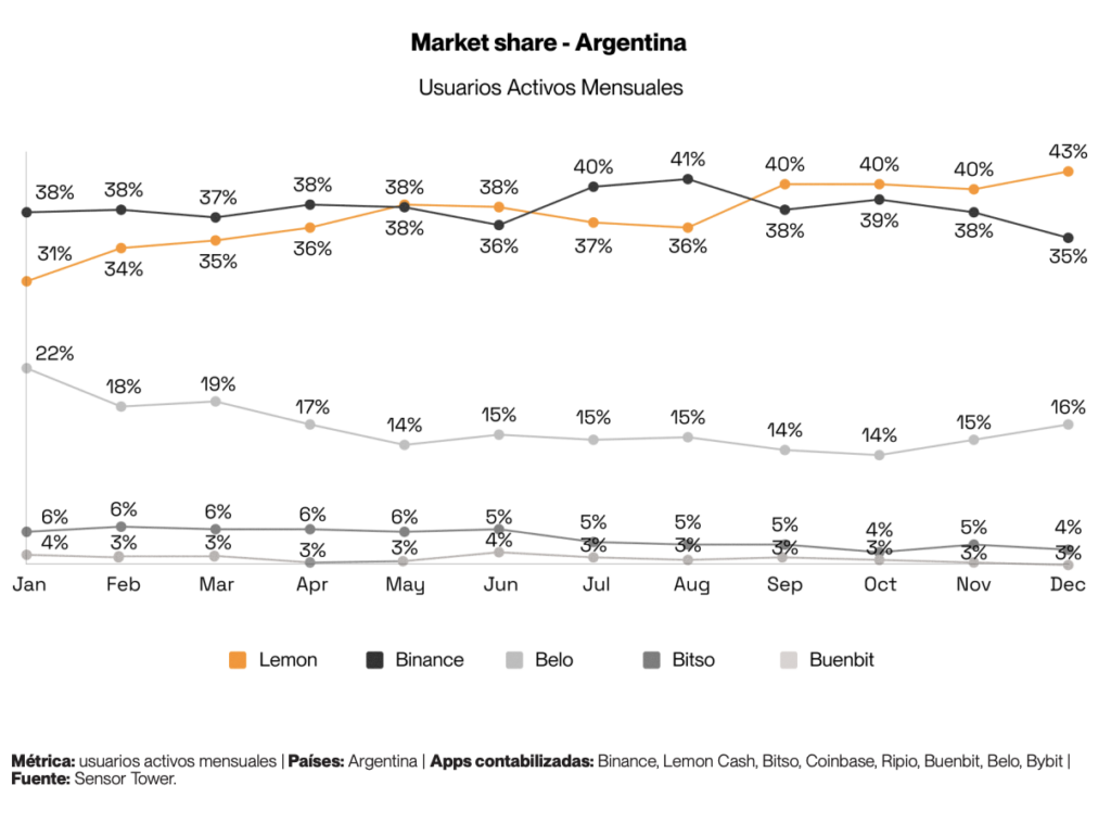 Lemon y Binance son los dos líderes del mercado argentino, representando en promedio el 70% de las sesiones activas durante todo 2025, con un 35% cada una.