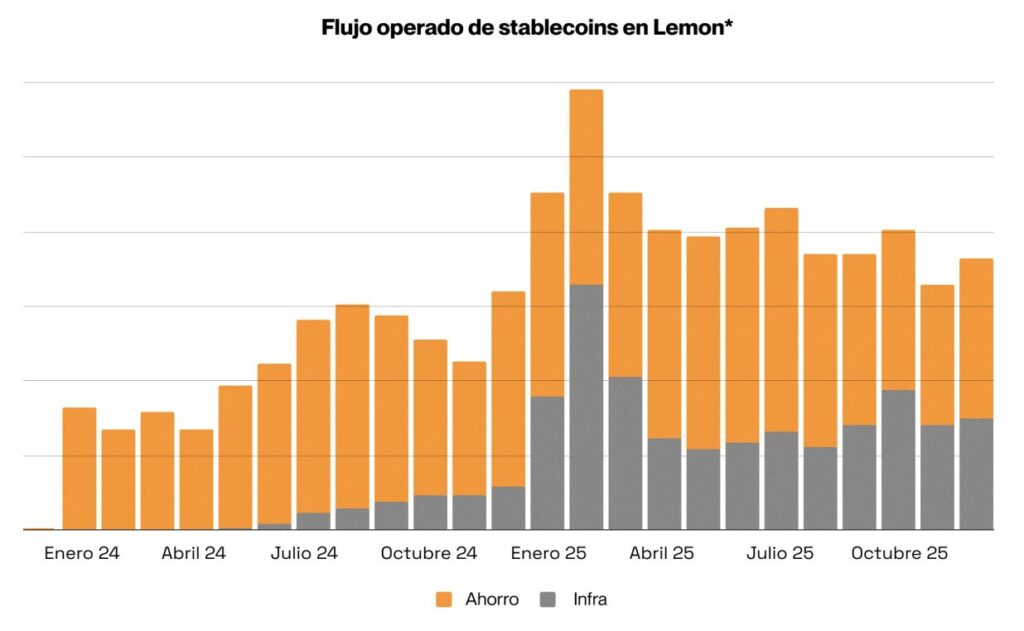 En Lemon, el volumen total operado de stablecoins creció 45% frente al año anterior. Si bien una parte importante se mantiene vinculada al ahorro, el crecimiento se explicó principalmente por su uso para cobros desde plataformas del exterior, ingresar dólares desde bancos locales o pagar en otros países como Brasil (PIX).