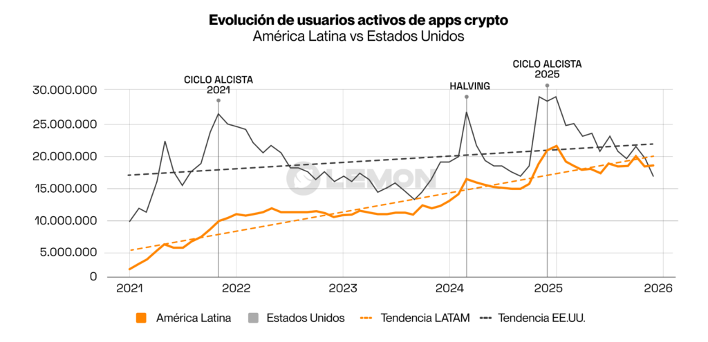 El reporte detalla cómo América Latina crece más rápido que Estados Unidos en usuarios activos, y mientras cada vez se habla menos de crypto, en Argentina hay 4 veces más personas usándolo que en el ciclo alcista del 2021, sin percibirlo.