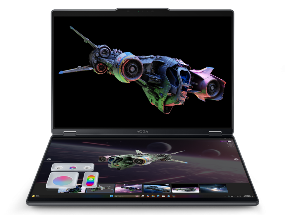La mitad inferior de la laptop incorpora una pantalla táctil con snap-on pads que brindan accesos rápidos para ajustar la iluminación, el ángulo de visualización y el tono, diseñados para minimizar interrupciones y mantener a los creadores en estados de flujo creativo en 3D. Mientras la imagen seleccionada se muestra en la pantalla superior de la laptop, los snap-on pads despliegan el ajuste objetivo directamente en la pantalla inferior, en el lugar donde se posicionan, permitiendo modificaciones intuitivas. Impulsando todo este innovador hardware creativo se encuentran un procesador Intel® Core™ Ultra 7 junto a una GPU NVIDIA® GeForce RTX™ 5070, más que capaces de manejar las complejas tareas creativas y de renderizado en 3D para las que está diseñado el Yoga Book Pro 3D Concept.