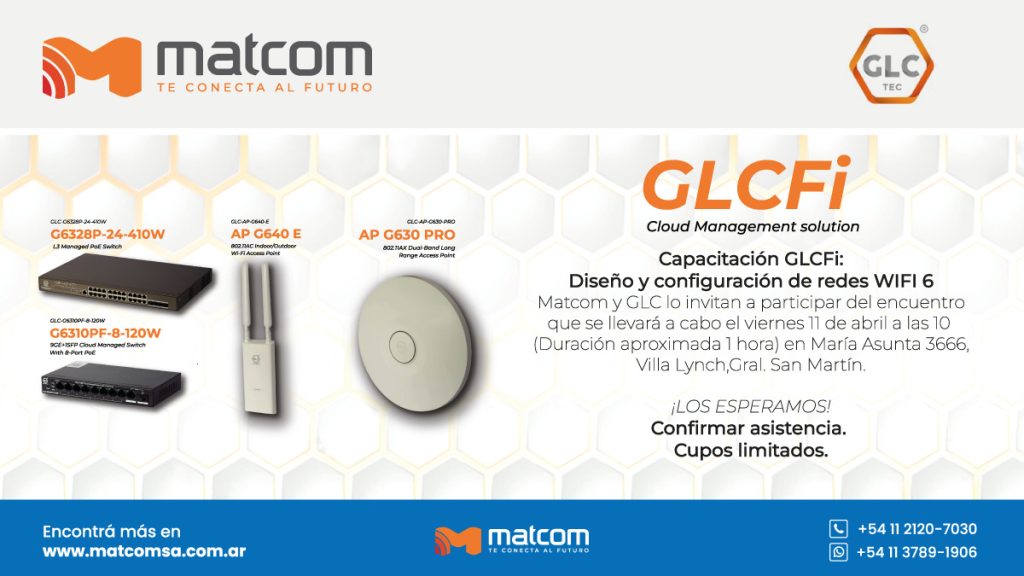 Este próximo viernes 11 de abril, a las 10 hs, Matcom, junto con GLC, realizaráN una capacitación en GLCFi. Esta es una solución definitiva para empresas que buscan una conectividad de alto rendimiento, una gestión centralizada y una capacidad de escalabilidad que les permita crecer sin comprometer la estabilidad de su red.
