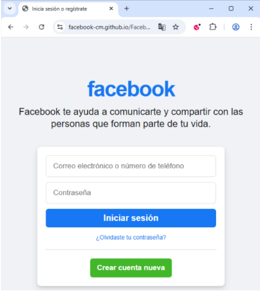 En otra campaña observada durante el cuarto trimestre de 2025, CPR detectó una página de phishing con temática de Facebook, distribuida por correo electrónico y alojada en facebook-cm[.]github[.]io. La página suplantaba el portal de inicio de sesión de Facebook y se presentaba completamente en español, con una imagen de marca, un diseño y solicitudes de autenticación familiares. Se solicitaba a los usuarios que ingresaran su dirección de correo electrónico, número de teléfono y contraseña, que posteriormente fueron recopilados por los atacantes para permitir el acceso no autorizado a la cuenta y posibles abusos posteriores.