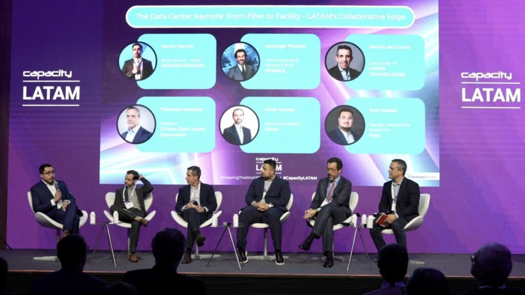 Conferencia ‘The Data Center Keynote: From Fiber to Facility – LATAM’s Collaborative Edge’. Integrada por Daniel Correia, Senior Advisor – LatAm en DatacenterHawk; Javier Lacasa, Executive President en UFINET; Gabriel del Campo, Data Center Vice‑President en Cirion Technologies; Ruet Valliani, Manager, Network Site Investment en Meta; Ambrogio Michetti, Chief Corporate & Revenue Officer en Sparkle; Francisco Basoalto, President en Chilean Data Centre Association.